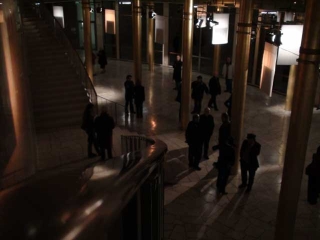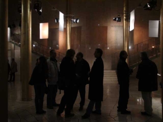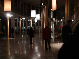 ![]() ...Die Klangereignisse treten vereinzelt, fast zusammenhangslos auf. Verstärkt wird diese Wirkung durch den Einsatz von Elektrostaten als Lautsprecher. Diese Elektrostaten mit ihren extrem kleinen Abstrahlwinkeln werfen die Klänge wie Lichtstrahlen in den Raum, so dass deren Reflexionen auf den gebogenen Wänden der Goldhalle die architektonische Besonderheit klanglich erfahrbar machen. Isoliert stehen die Klänge in diesem überdimensionierten Raum. Nirgends will sich Nähe oder gar Intimität einstellen, alles bleibt offen, bleibt auf Distanz.