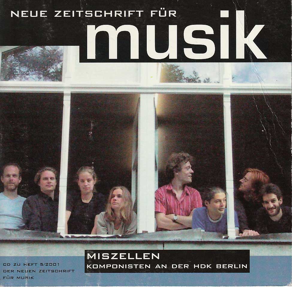 | 2000 | ƒlöte, sounds & live-electronics Solowerk — ca. 12min für Flöte und Live-Elektronik Studioproduktion — UA am 12.5.1996 im Podewil Berlin (Dietmar Wiesner) veröffentlicht auf : MISZELLEN - Komponisten an der HdK Berlin © 2001 by WERGO — T 5682, Beilage : Neue Zeitschrift Für Musik 2001 Nr 5 |