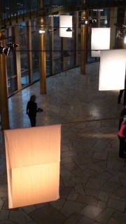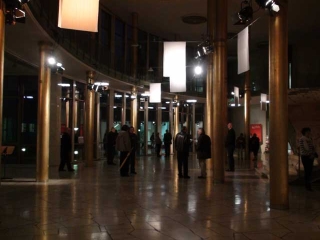 ![]() ...Die Klangereignisse treten vereinzelt, fast zusammenhangslos auf. Verstärkt wird diese Wirkung durch den Einsatz von Elektrostaten als Lautsprecher. Diese Elektrostaten mit ihren extrem kleinen Abstrahlwinkeln werfen die Klänge wie Lichtstrahlen in den Raum, so dass deren Reflexionen auf den gebogenen Wänden der Goldhalle die architektonische Besonderheit klanglich erfahrbar machen. Isoliert stehen die Klänge in diesem überdimensionierten Raum. Nirgends will sich Nähe oder gar Intimität einstellen, alles bleibt offen, bleibt auf Distanz.
